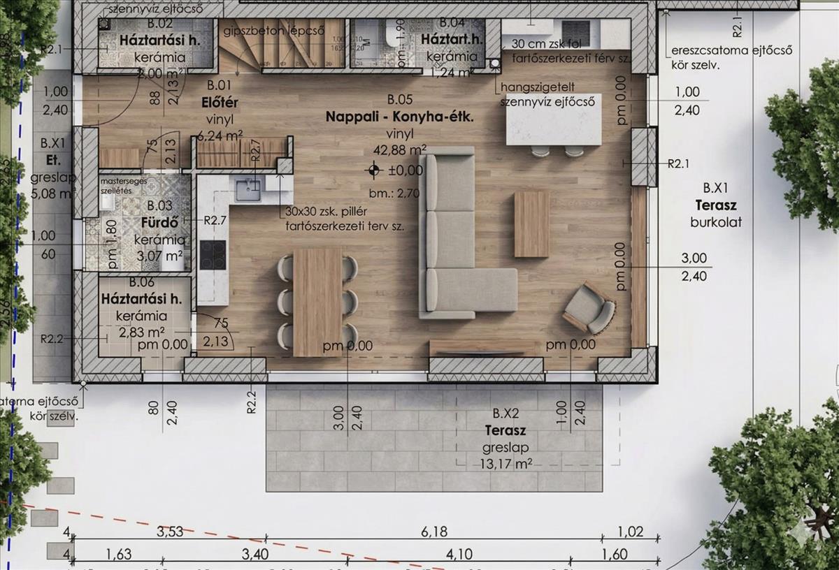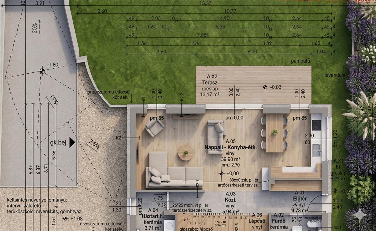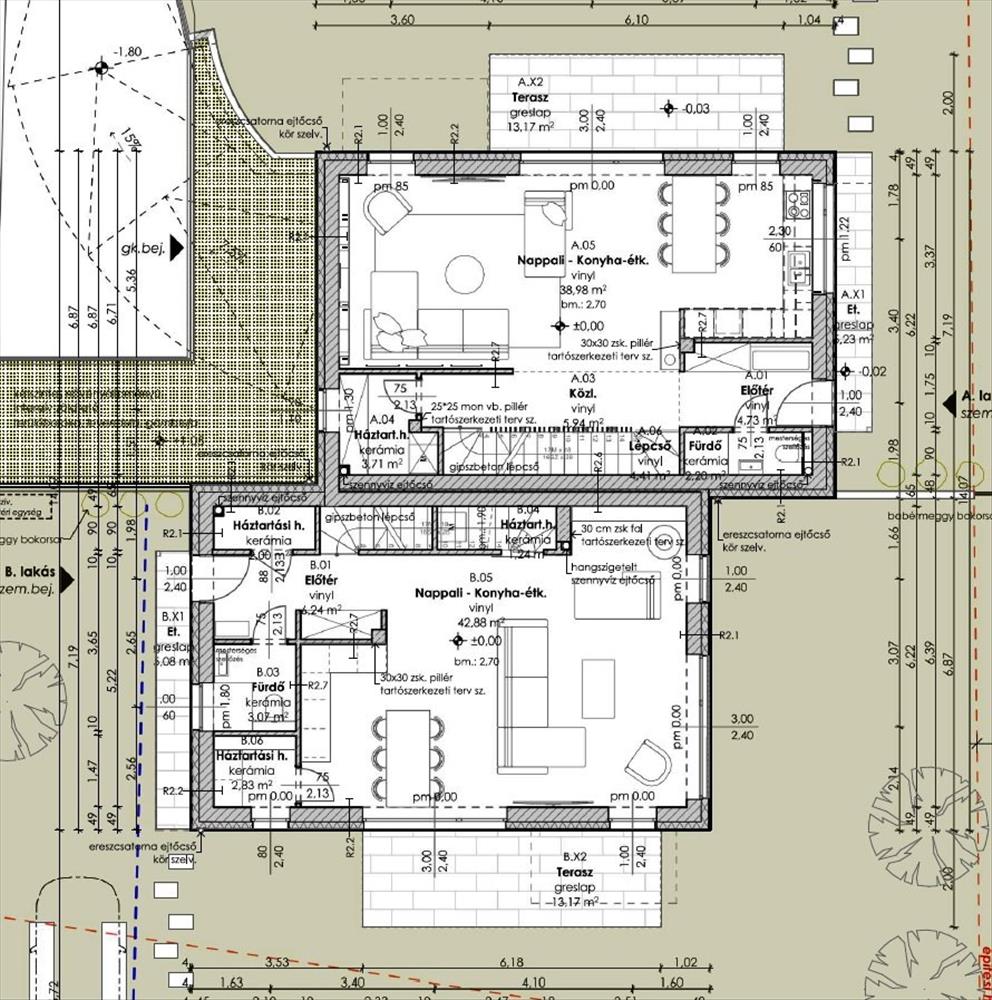 A/2 lakás (felszíni beállóval): 118nm +35nm terasz, Nappali + 4 hálószoba, 280nm -es kert, 2 felszíni beállóval- 222, 5Mft.