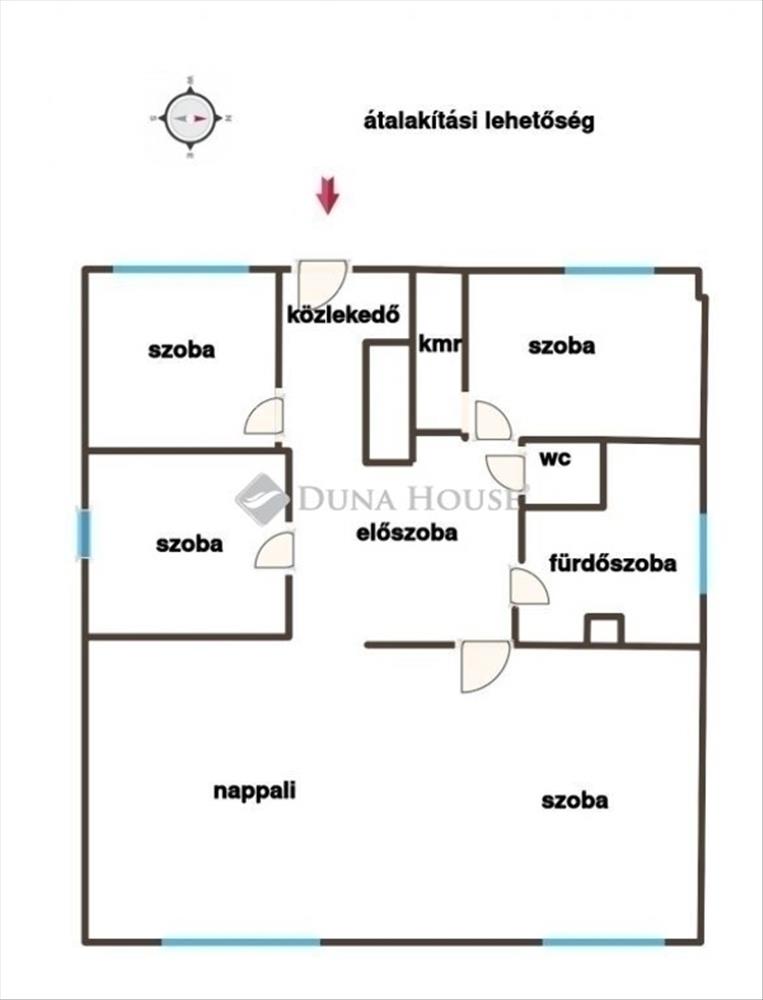 Modernizálási lehetőség: Egy kisebb átalakítással egy hatalmas, közel 40 nm -es amerikai konyhás nappali és 3 külön nyíló hálószoba hozható létre.