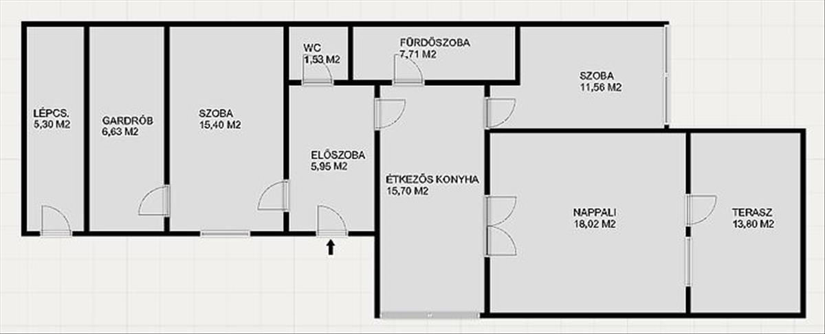 A 83 m2 földszinti lakás részei: előszoba, étkezős konyha, nappali, 2 hálószoba, gardrób, fürdőszoba, wc, terasz.