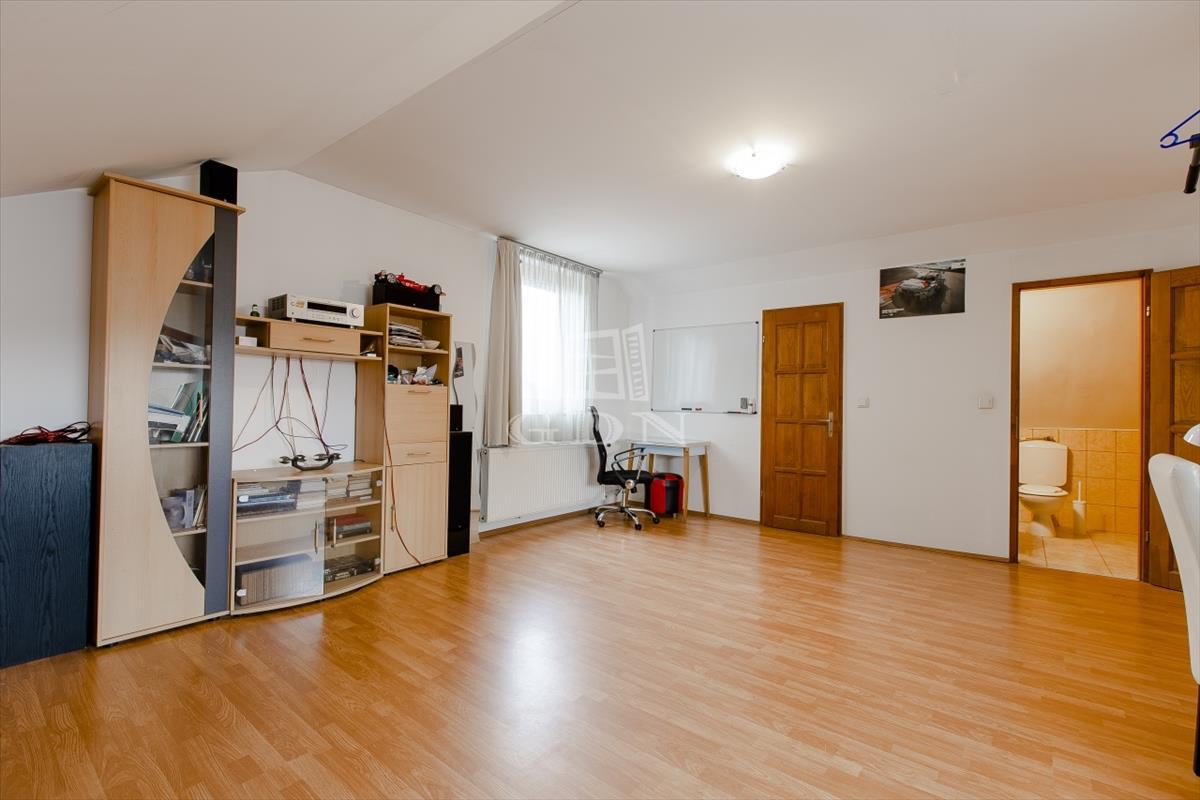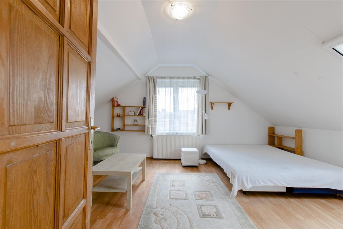 Szintén a közlekedőből jutunk fel a beépített teljes értékű tetőtérbe, ahol ki lett alakítva 2 db külön nyíló szoba, gardrób helyiség és egy zuhanyzós fürdőszoba. a nagyszoba további lehetőségeket rejt magába, szinte bárhogy lehet alakítani, akár 2 db szobává is.