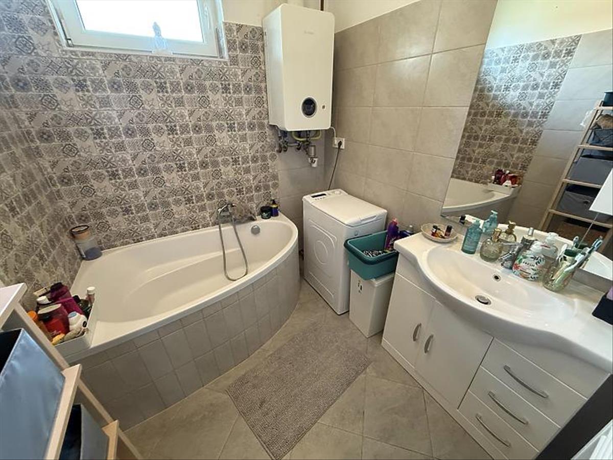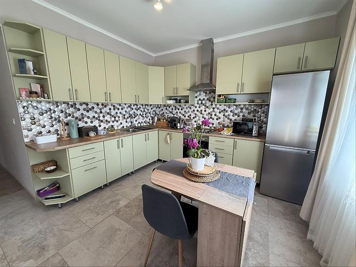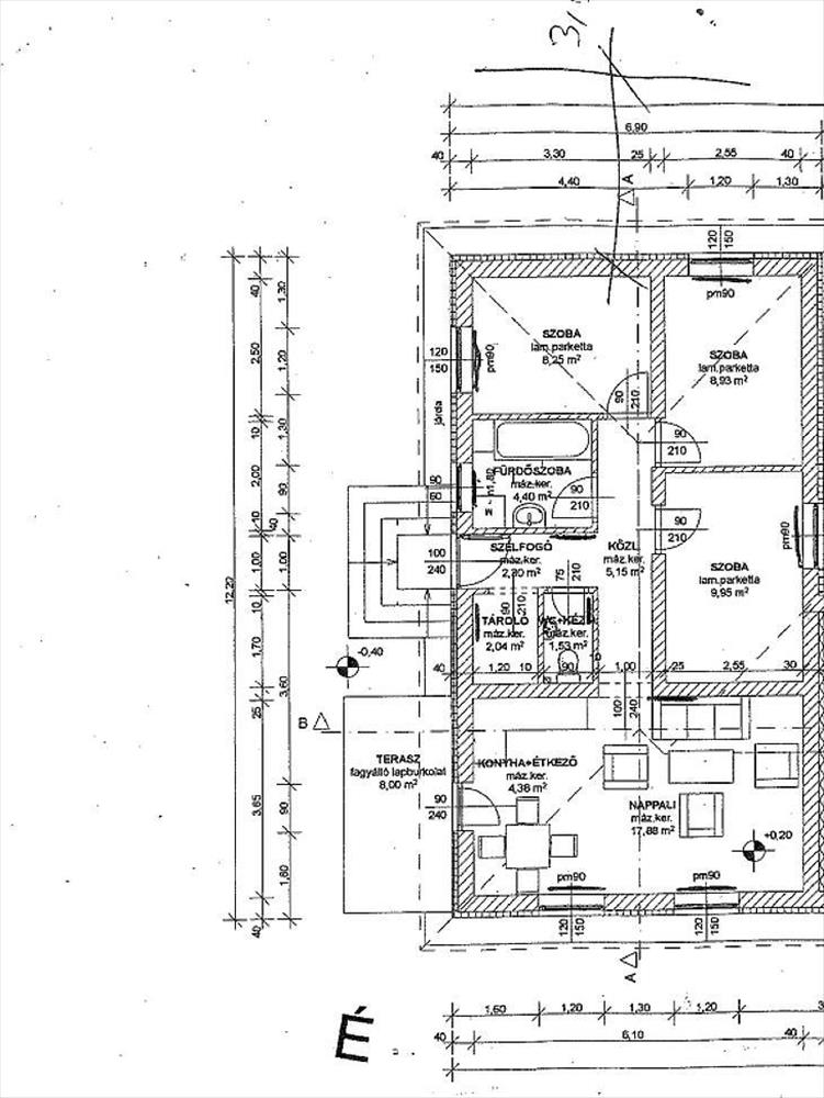 Amerikai konyhás nappali + étkező 8 négyzetméteres teraszkapcsolattal, 3 szoba, kádas fürdőszoba, wc, közlekedő, előszoba.