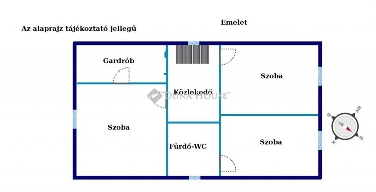 Emelet: Világos közlekedőn keresztül jutunk fel a felső szintre, ahol három szoba (erkélykapcsolattal), egy fürdőszoba WC-vel, valamint egy gardrób lett kialakítva.