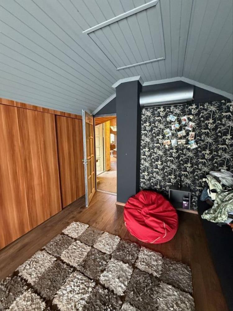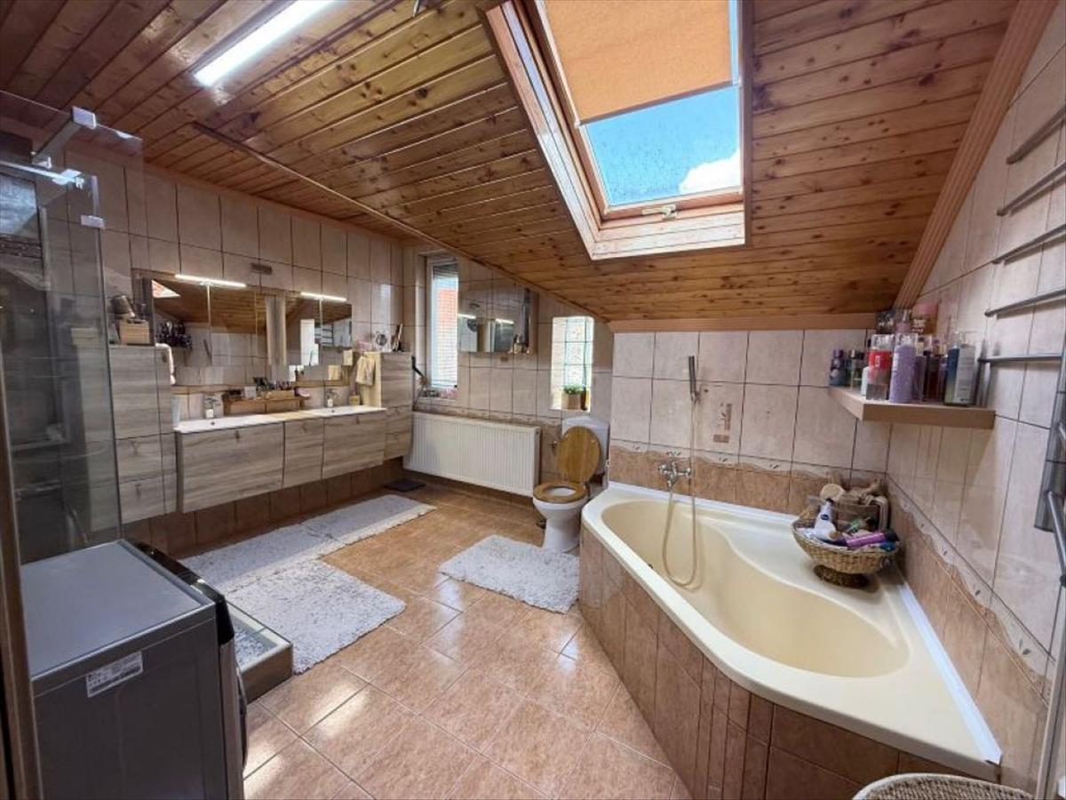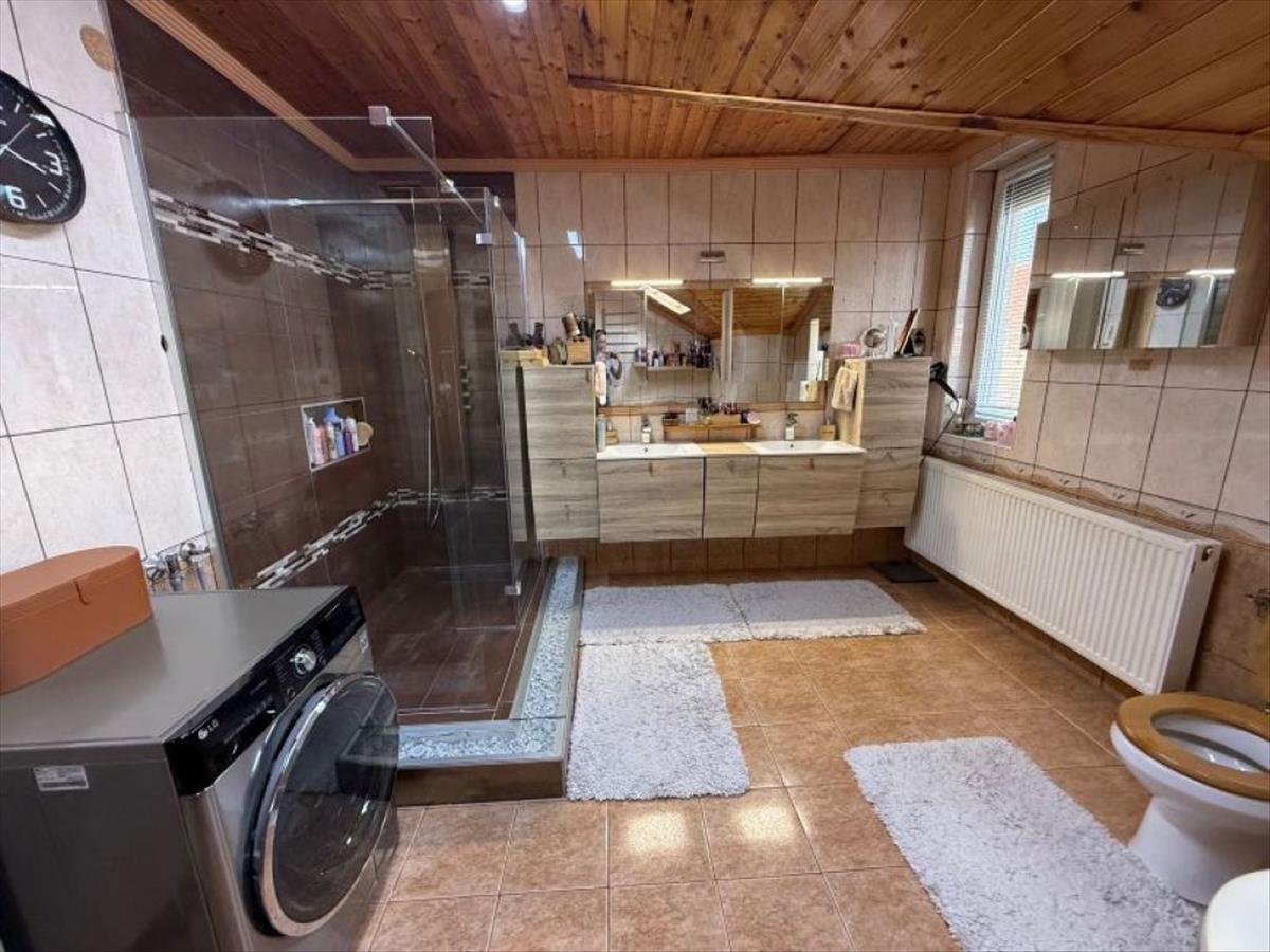 Az emeleti közlekedőből különnyíló szobák mellett egy hatalmas fürdő is helyet kapott walk-in zuhanykabinnal és egy tágas sarokfürdőkáddal.