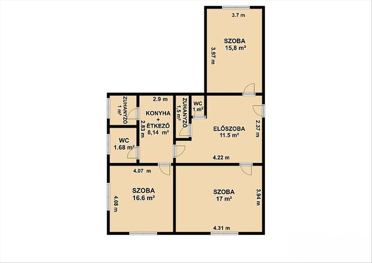 Elrendezés: 3 szoba, konyha + étkező, 2 zuhanyzó, 2 wc, közlekedő, előszoba.