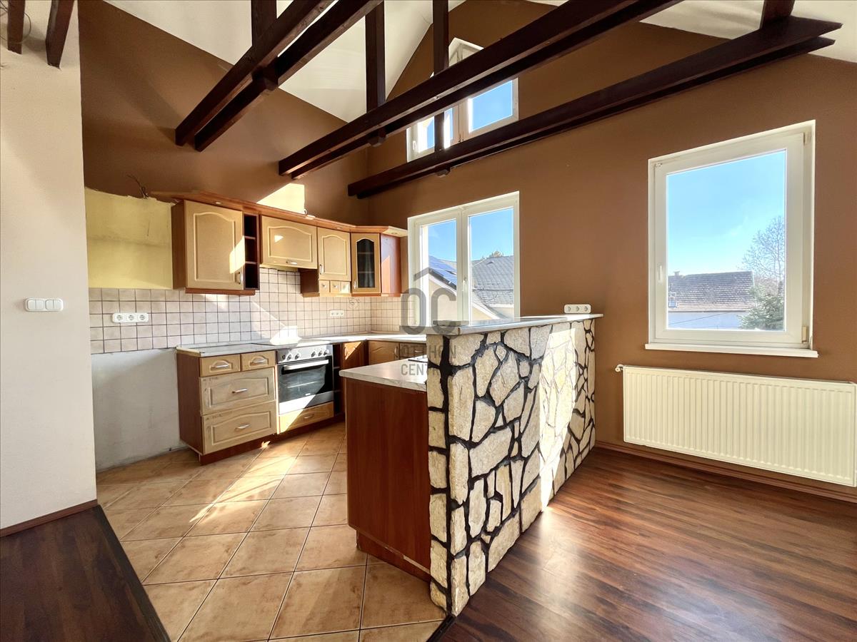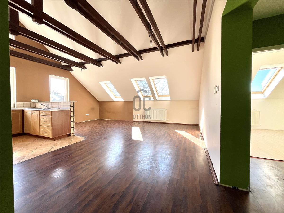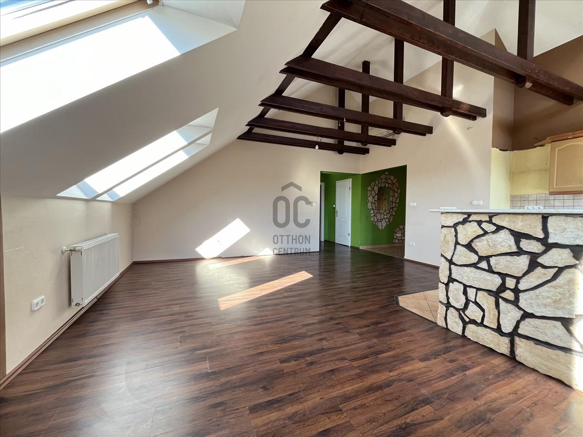 Az amerikai konyhás nappali különleges, impozáns tér látszó gerendákkal, a tetőgerincnél 4, 5 m-es belmagassággal.