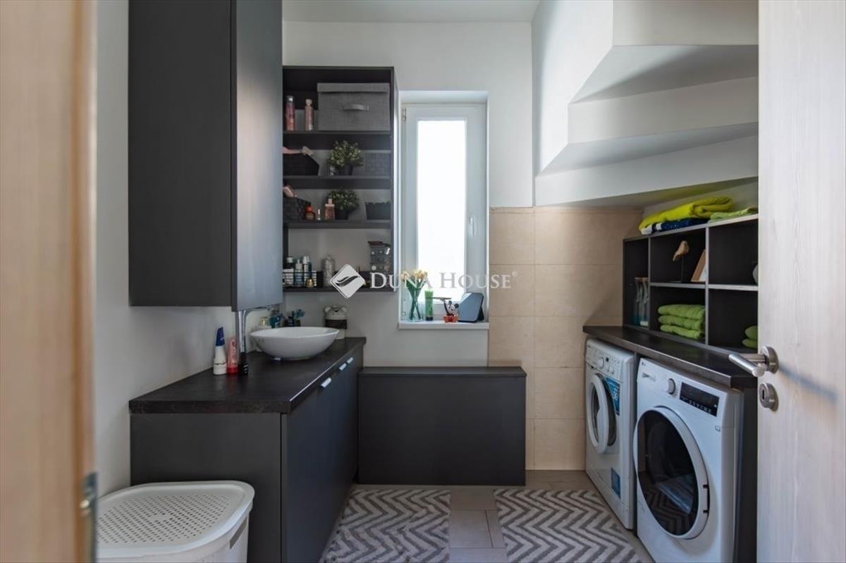 A ház több pontján is vissza köszön az egyedileg asztalos által terveztetett bútorok összhangja. a földszinten a vendég illemhelyiségen kívül található egy nagyobb méretű fürdőszoba is mely egyben mosókonyhaként is funkcionál, ez jelenleg a szülői háló fürdőszobájaként üzemel, mivel a jelenlegi tulajdonosok a garázst szobává alakították.