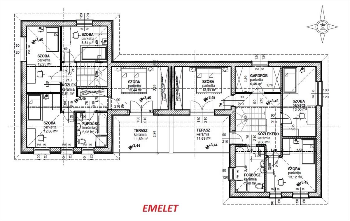 Az egész telek 555 nm. Az egyik ikerfél 113, 38 nm-es + 25, 2 nm garázs, amerikai konyhás nappali + 4 hálószobás. a másik ikerfél 117, 33 nm-es +25. 2 Nm garázs, amerikai konyhás nappali + 3 hálószobás, gardróbszobás. Mindkét részen egy emeleti és egy kertkapcsolatos terasz is használható.
