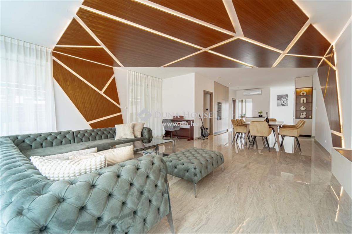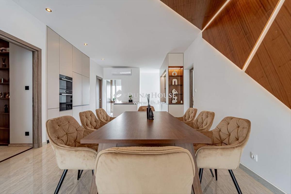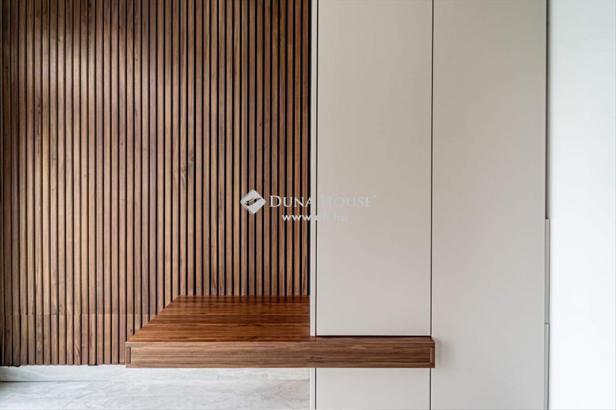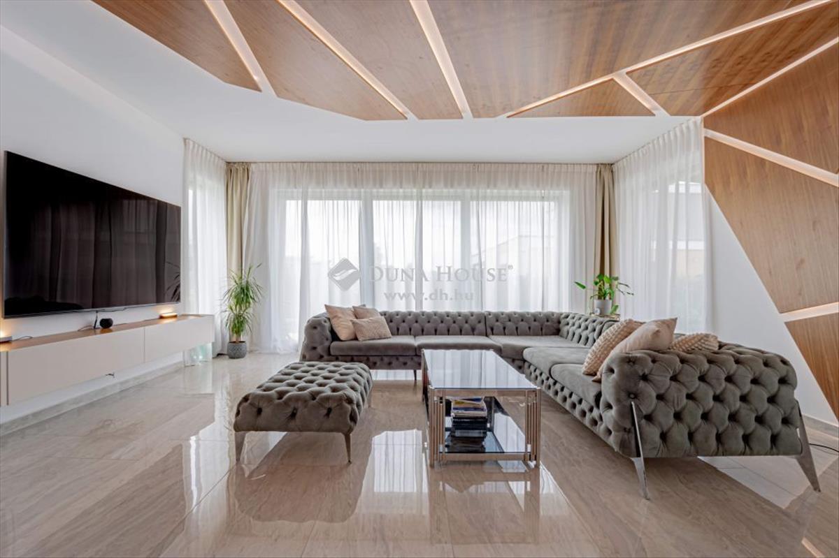Nappali+3 hálószoba található a házban, két fürdőszobával és külön illemhelyiséggel. Az otthon minden szegletét belsőépítész által terveztette a tulajdonos. Az összes tér és bútor összhangban van kialakítva egymással, a ház bármely területén járunk, mindenhol visszaköszön valami, ami az alapos tervezés eredménye. Minden helyiségben egyedileg ide gyártott beépített bútorokat találunk melyek az egész ház stílusával harmonizálnak. a gondos tervezés eredményeképp itt nem lesz olyan tárgy aminek nem lehet megtalálni a maga helyét.