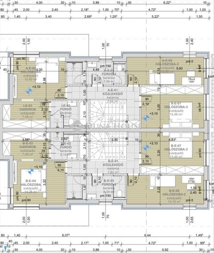 Emeleten: 3 tágas szoba, gardrób, egyik szobának külön fürdő+wc kialakítva, fürdőszoba, közlekedő