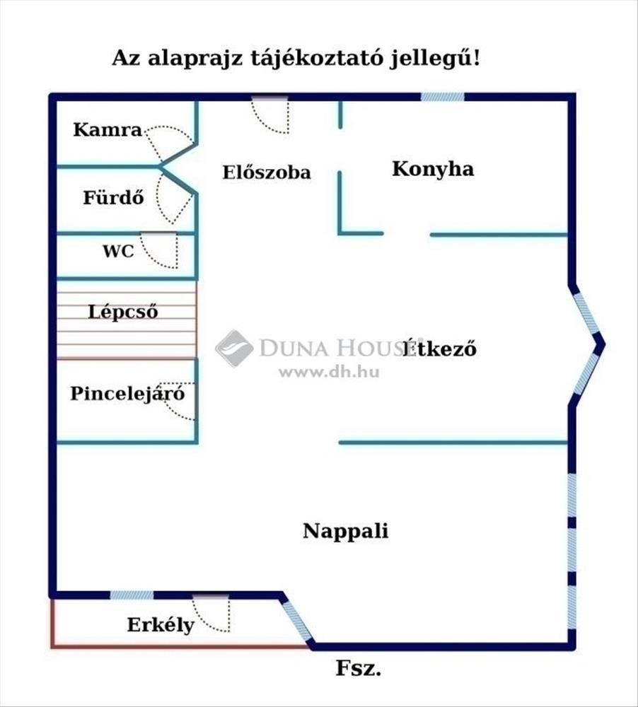 A bejárati ajtón belépve balra a konyha, jobbra a kamra, fürdő, wc található. a bejárati ajtóból egyenesen haladva balra a tágas étkező, jobbra az emeletre vezető széles lépcső+ a pincelejárat található. Az étkezőből egyenes tovább haladva a tágas, világos nappaliban találjuk magunkat, ahonnan az erkélyre juthatunk ki.