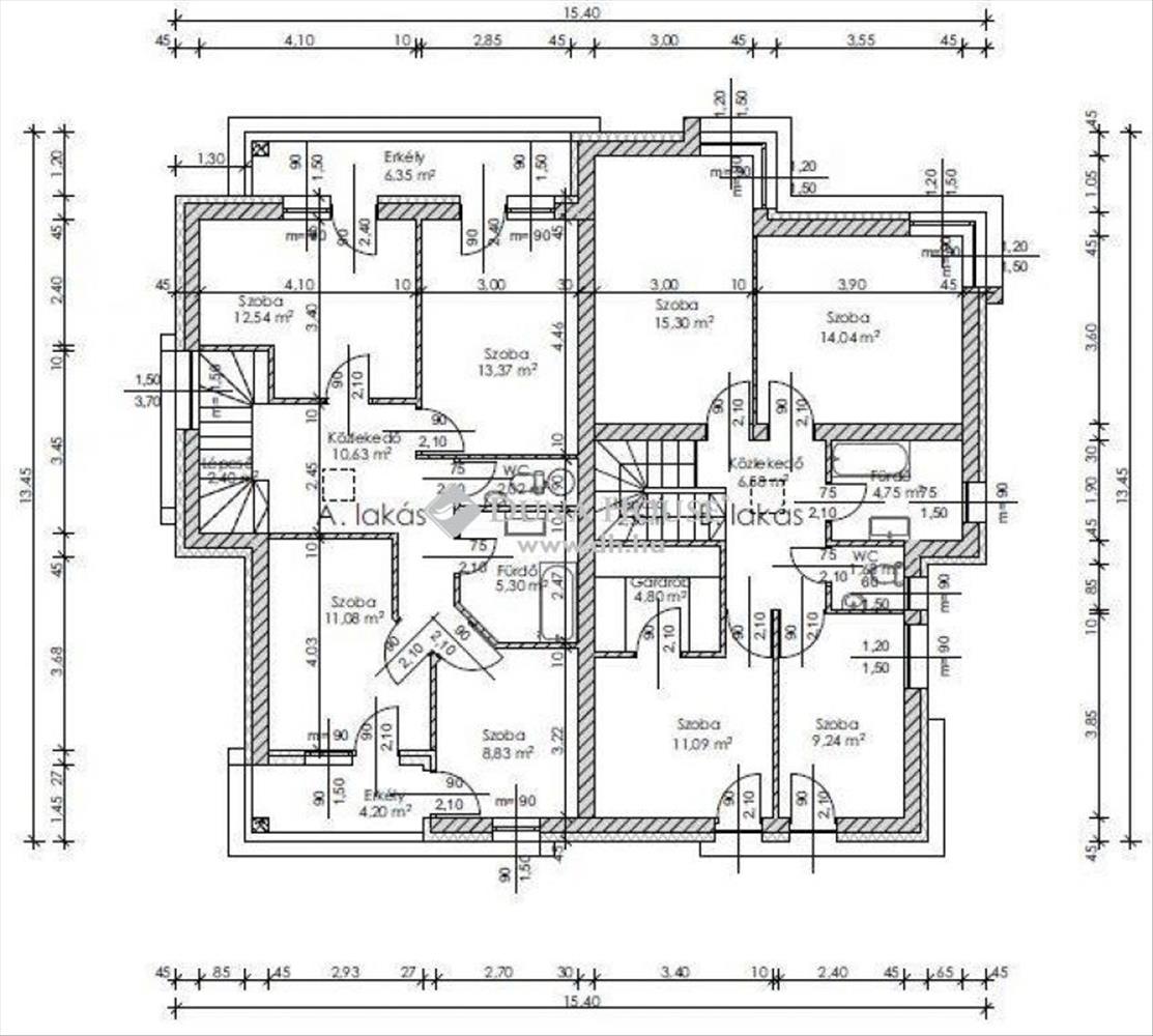 A lakás emeleti helyiségei: 4 db szoba, közlekedő, wc, fürdő.