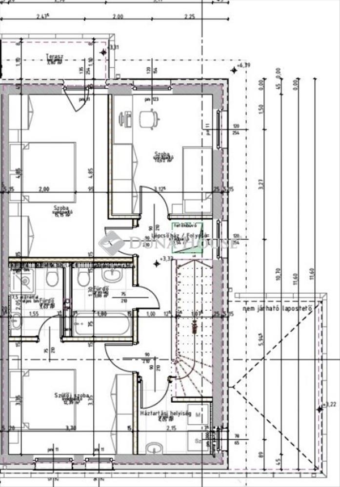 A lakás emeleti helyiségei: 3 db tágas hálószoba, közlekedő, 2 db fürdőszoba (1 db a szülői hálószobához), háztartási helyiség, erkély (3, 8 nm ).