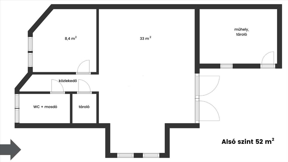 - Az alsó szint korábban varroda-szabászműhely volt, de alakítható garázzsá, lakássá vagy irodává.