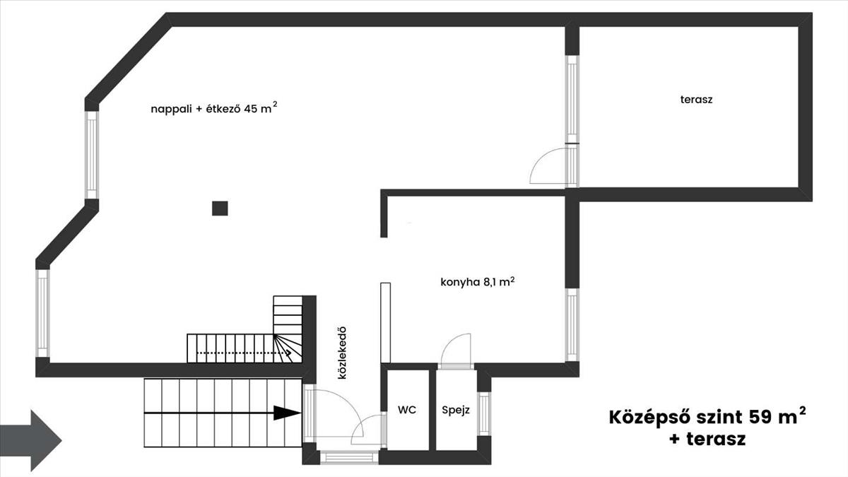 - a földszinten tágas nappali–étkező, napfényes konyha, kamra, wc és egy 15 m²-es terasz.