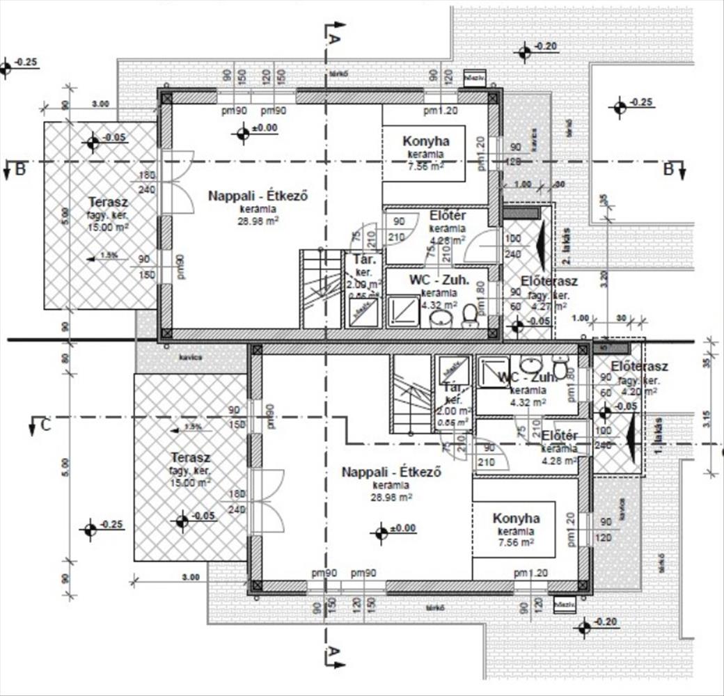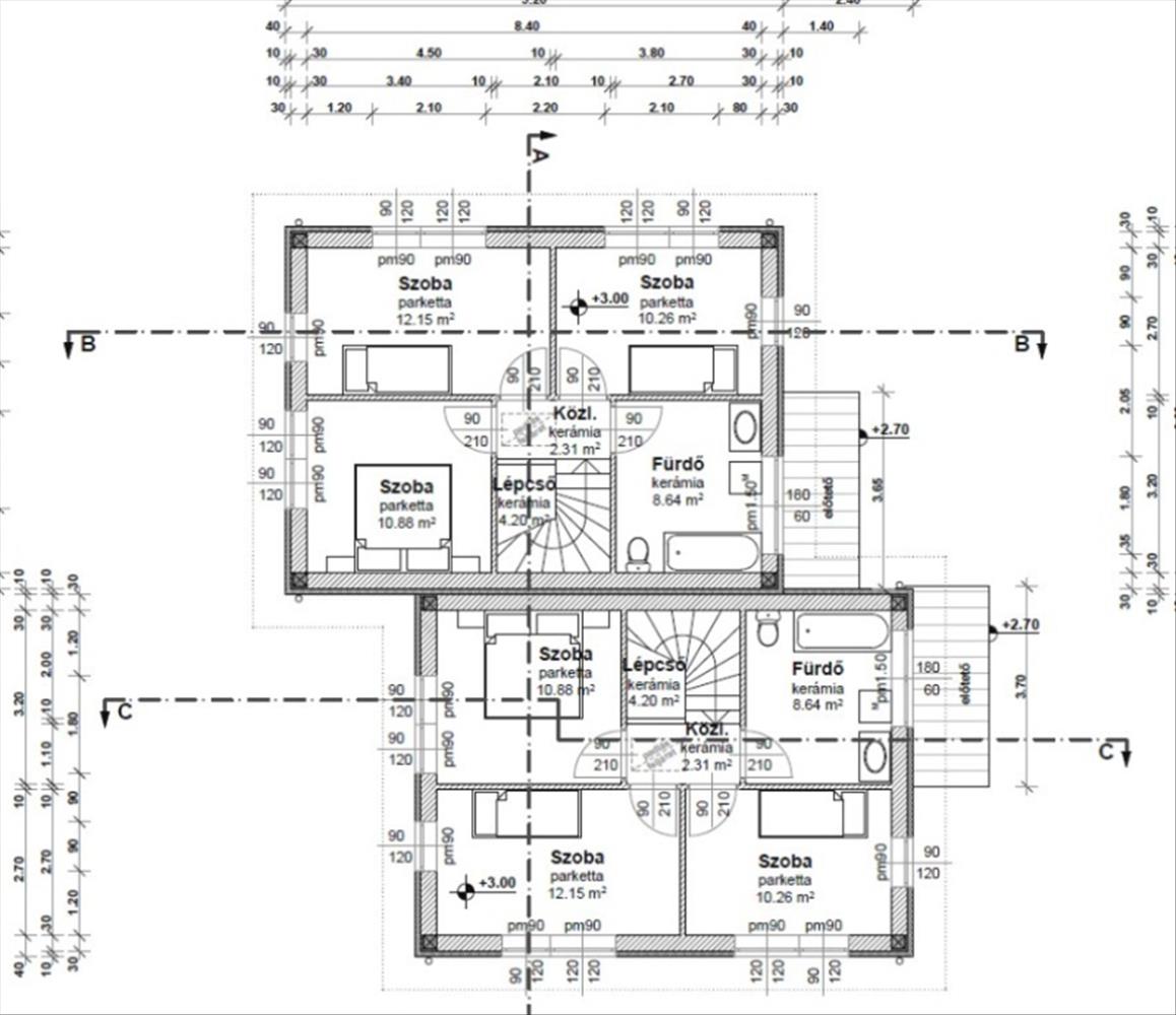 Műszaki:Vasbeton sávalap, dupla fal a lakások között, 30-as Porotherm tégla teherhordó falak, 10-es Porotherm válaszfalak, vasbeton közbenső és fa emeleti födém. a külső falak 12 cm-es Dryvit hőszigeteléssel, az emeleti födém 30 cm-es (fújható cellulóz )hőszigeteléssel készül, cserép héjazással. Nyílászárók(Schüco típusú ) 3 rétegű hő- és hangszigetelő thermo üveggel, kívül, belül fehér színben. Fűtés és a meleg víz hőszivattyúról H tarifával, mindenhol padlófűtés. 1 Darab hűtő -fűtő klíma 3, 5KW-os nappaliban, összesen 5 db. Klíma kiállás a hálószobákban, nappaliban, lépcsőházban.