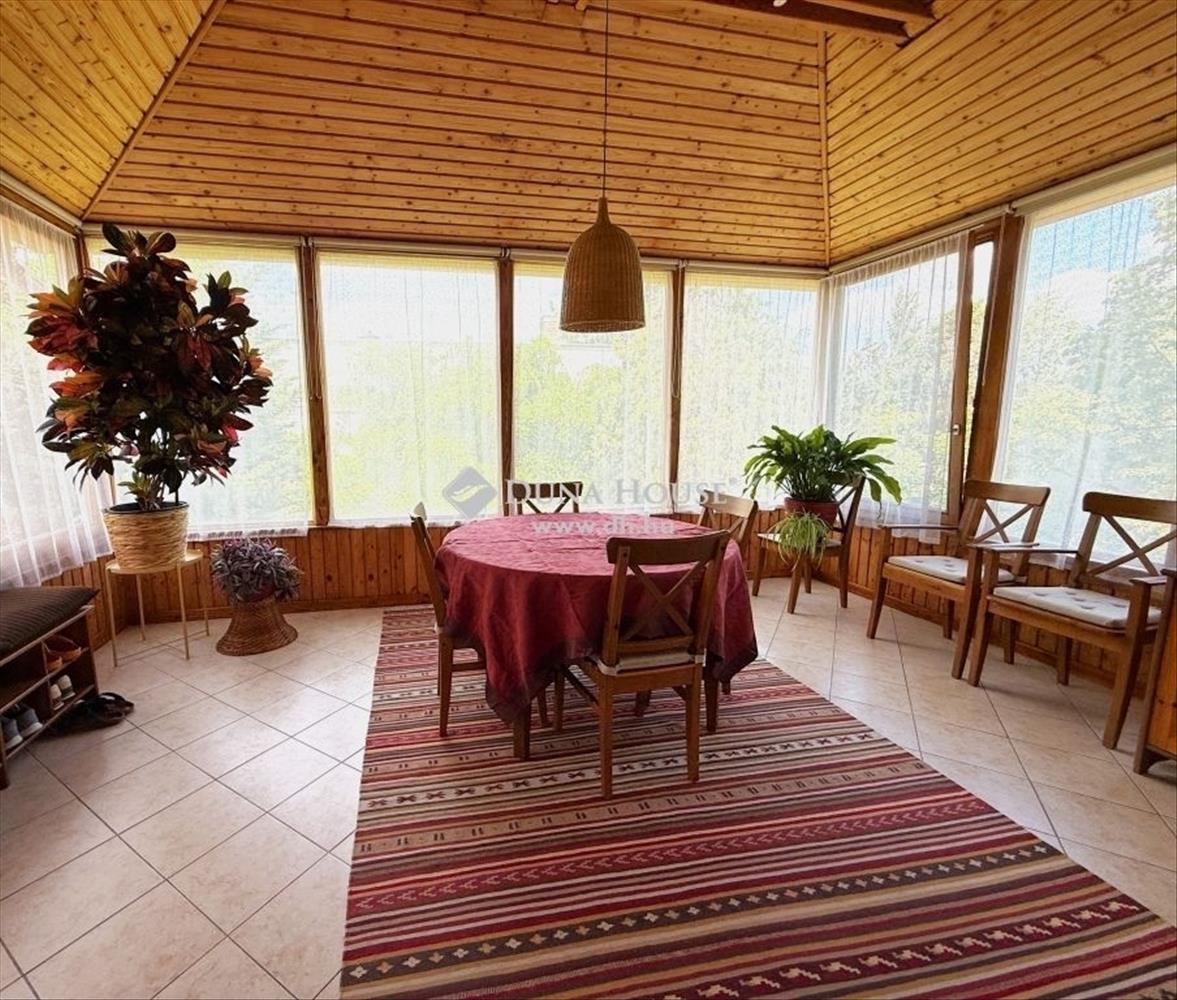 Az emeleti lakrész kandallós nappali plusz 2 normál méretű szobával és gardrób helyiséggel, konyhával, fürdőszobával és egy körbeüvegezett étkező-előtérrel került kialakításra. Ezen a szinten 2 beltéri klíma is beépítésre került.