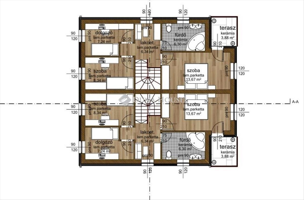 A nettó 88, 5 m²-es, kétszintes lakótér átgondolt, praktikus kialakítással készül. a földszinten tágas, világos nappali, konyha-étkező és kiszolgáló helyiségek valamint egy szoba találhatók, az emeleten pedig három külön nyíló hálószoba biztosítja a kényelmes családi életteret. a két terasz további lehetőséget kínál a pihenésre, reggeli kávézáshoz vagy akár esti kikapcsolódáshoz.