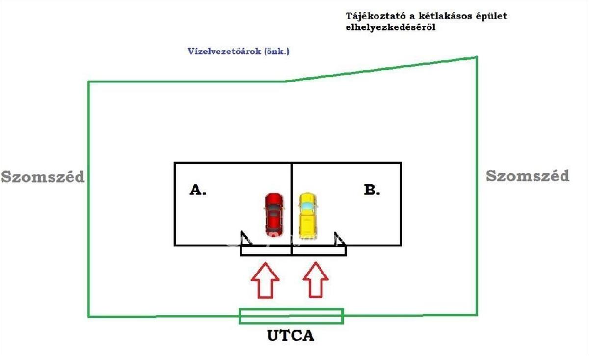 A telek remek adottságainak köszönhetően széles az utcafront, így a telket pont el lehetett felezni az a. És b. Épületekhez. Mindkét lakrészhez saját garázs és kert, valamint önálló fogyasztásmérők lesznek.