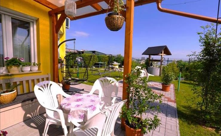 A nappalit a zárt terasz köti össze a hangulatos kerttel, amelybe öntözőrendszert is építettek.