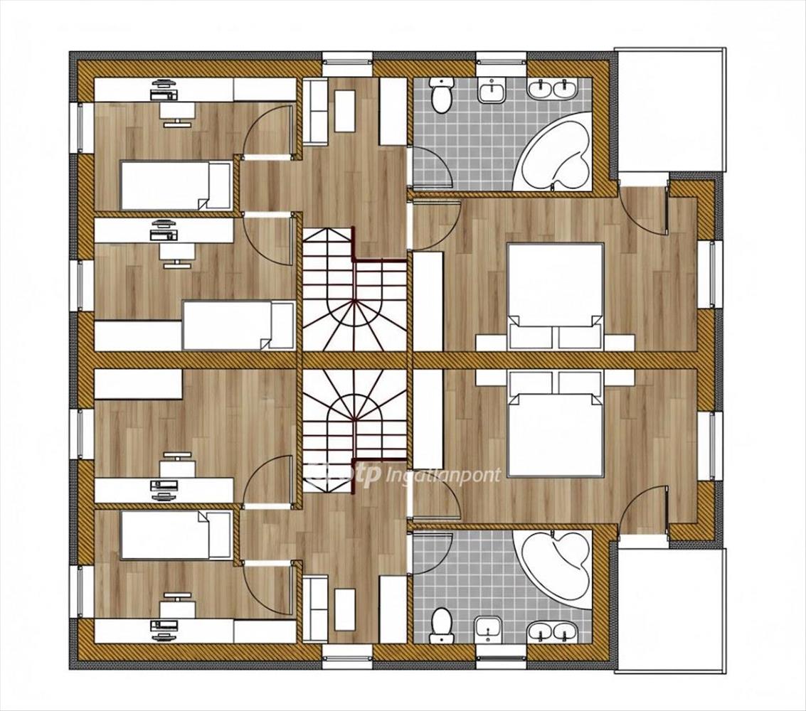 Emelet: Közlekedő (6, 3 m2), Fürdőszoba + wc (6, 3 m2), Három külön nyíló hálószoba (13, 7 m2, 8, 3 m2, 7, 2 m2), Emeleti terasz (3, 9 m2).