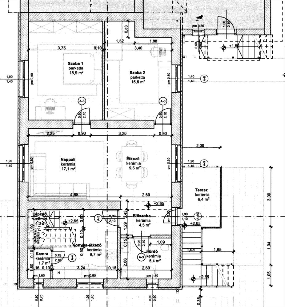 -A ház bejárata az az első szinten az épület keleti homlokzatán van kialakítva, melyről egy 6m2-es teraszról lépünk be az előszobába és a 26, 5m2-es tágas, napfényes nappali - étkezőbe, innen nyílnak a 19m2-es, valamint a 15 m2-es hálószobák. Ezen a szinten fürdőszoba, és egy modern beépített konyha teszi kényelmessé az ott lakók életét.