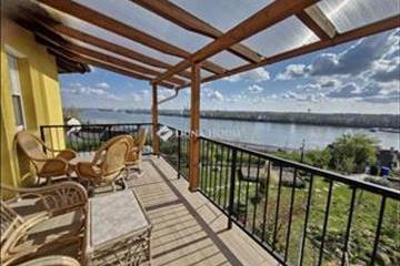 Emelet: Jelenleg három hálószoba került kialakításra, az emeleten található egy sarokkádas fürdőszoba, valamint az egyik hálószobához saját erkély is tartozik. a másik, nagy terasz a télikert tetején helyezkedik el, ahonnan lélegzetelállító panoráma nyílik a Dunára és a Budapestre. Padlófűtés van a házban, és a garázsban is, a szobákban parketta a többi helyiségben minőségi padlólap található.
