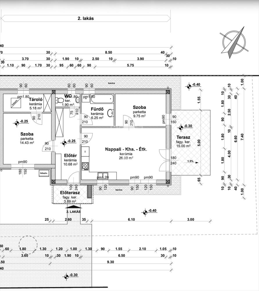 -előszoba(10, 68m2), amerikai konyha nappali(26m2), 2 szoba(9, 75m2, 14, 43m2), fürdőszoba(6, 25m2), WC(1, 9m2), tároló(5, 18m2), valamint 15 m2 és 3, 89 m2-es terasz.