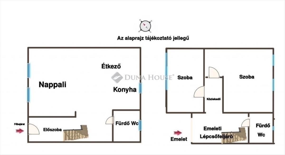 Emelet: 2 hálószoba, beépített szekrényes folyosó, zuhanyzós WC