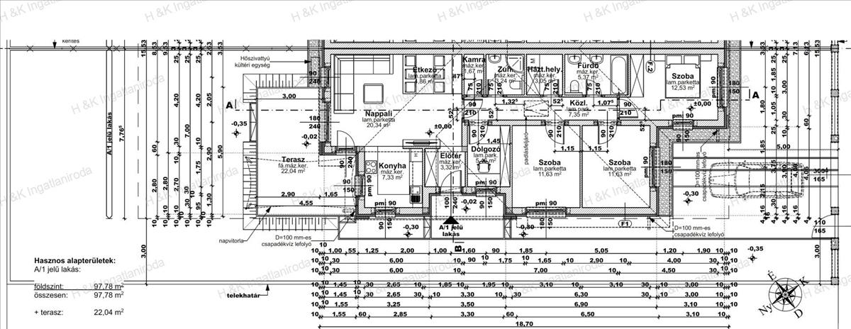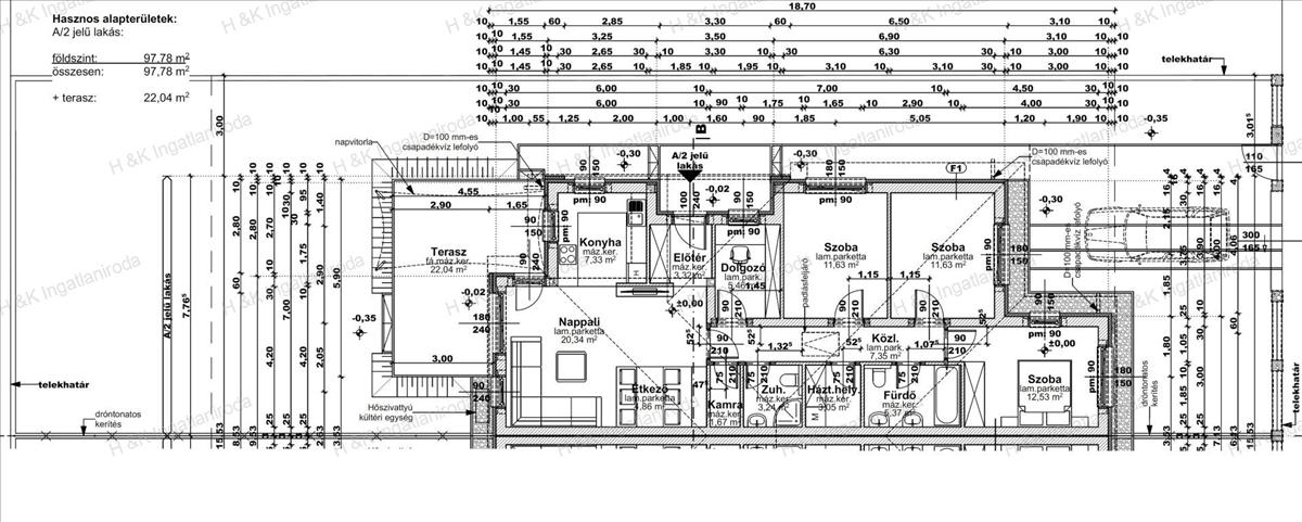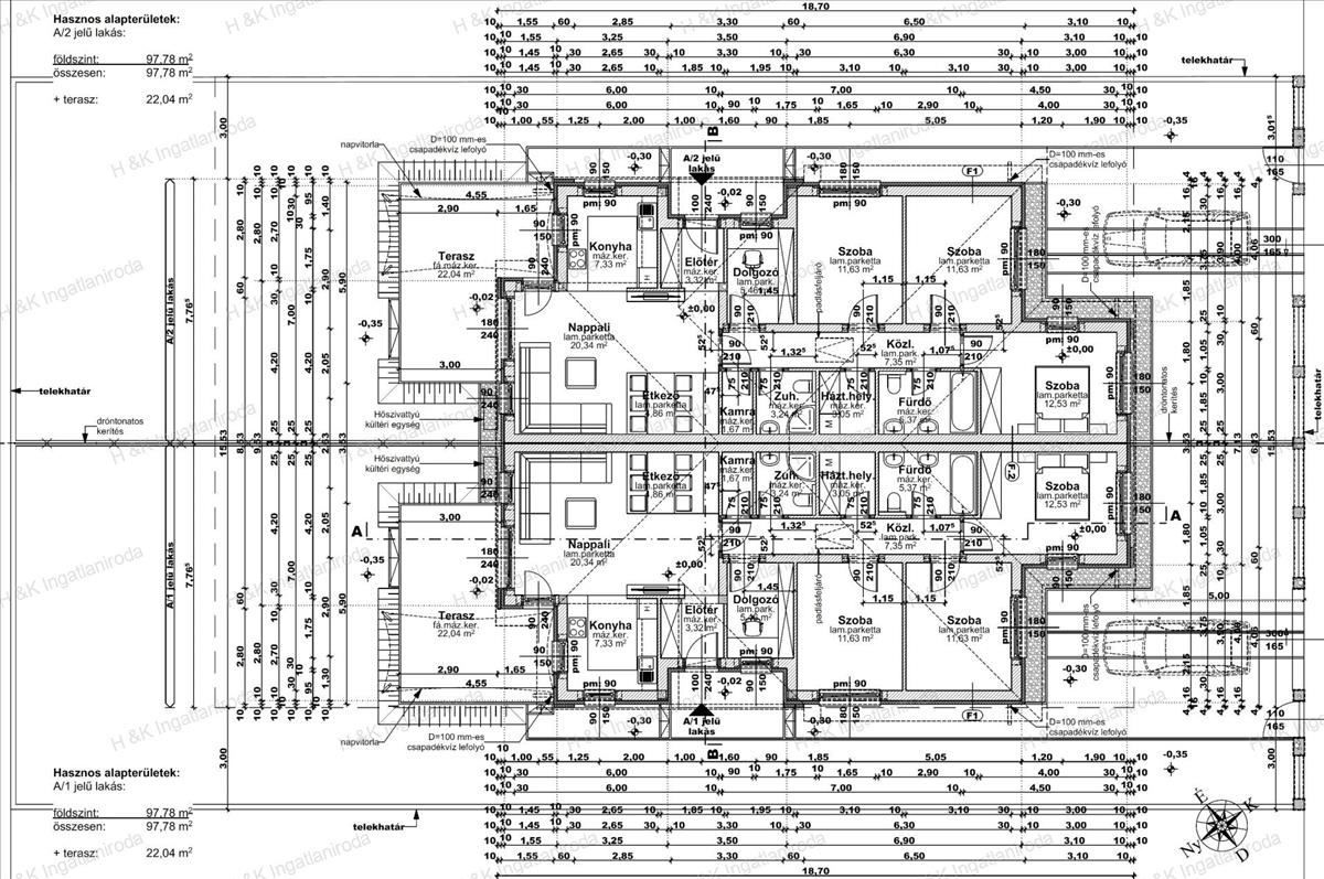 A lakások lakóterülete 97, 78 nm + 22 nm terasz, nappali + 3 + ½ szobás elrendezéssel, lakásonként kb. 490 Nm-es telekrésszel.
