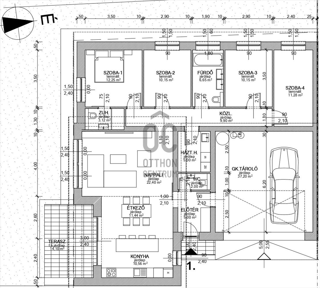 > a nappali-konyha-étkező rész önmagában 44 m2, amihez kapcsolódik a félig fedett 14 m2-es terasz