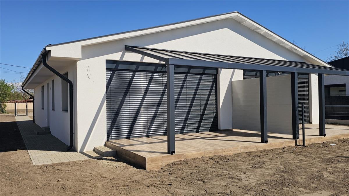 Motoros redőnnyel, zsalúziával és motoros szekcionált garázskapuval felszerelt.