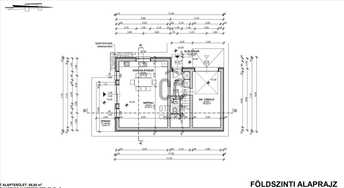 Fszt : konyha - étkező - nappali, wc, lépcső emeletre + garázs helyiségekből áll.
