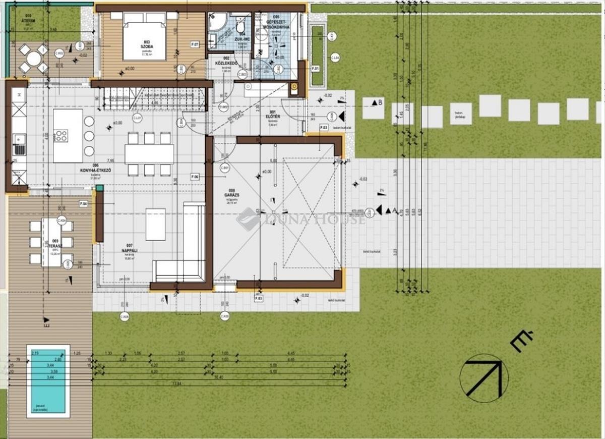 - kert: térkövezett és füvesített, kerítéssel körbekerített, auzomata öntözőrendszerrel ellátott