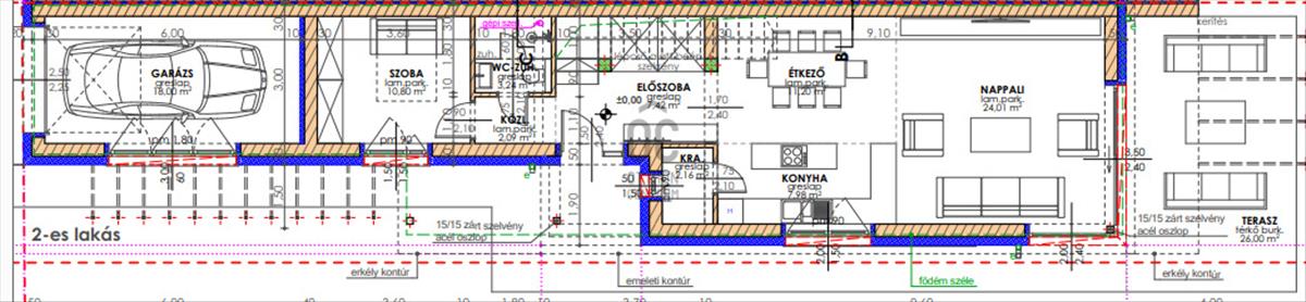 előszoba (9, 42 m2) konyha-étkező-nappali (43, 19 m2); kamra (2, 16 m2), 1 szoba (10, 8 m2), wc, zuhanyzó, garázs (18 m2) található. Terasz 26 m2