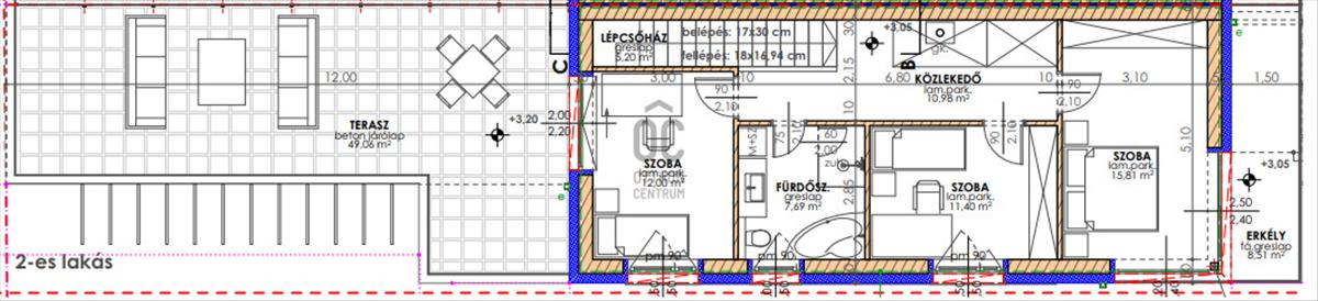-szoba (15, 15 m2) – zuhanyzós wc (4, 56 m2) -lépcsőház (5, 9 m2)