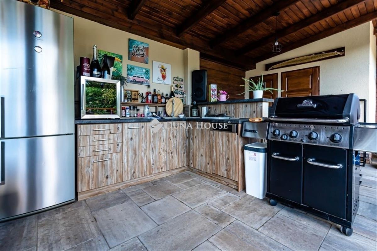 A ház külső tere is igényesen kialakított, ahol egy medence, jakuzzi, 15 méter hosszú filagória kiépített konyhával és szociális helységgel továbbá gyerekjátszótér, faház és csúszda áll a kisebbek rendelkezésére.