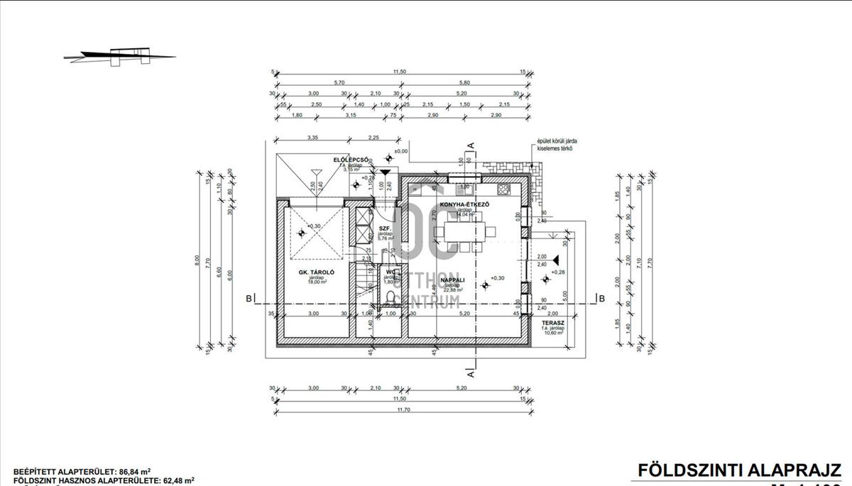 Fszt : konyha - étkező - nappali, wc, lépcső emeletre + garázs helyiségekből áll.