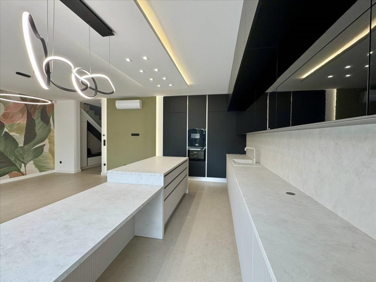 A belső elosztás átgondolt: tágas nappali, étkező és gépesített, minőségi konyhabútorral felszerelt konyha, három kényelmes hálószoba, három elegáns fürdőszoba, gardrób, háztartási helyiség és dupla garázs található benne.