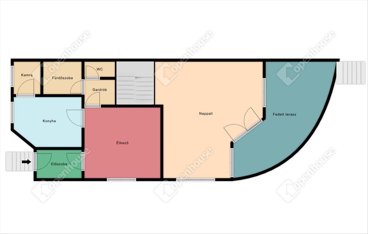 A földszinten helyet kapott a nappali, az étkező, a konyha, egy zuhanyzós fürdőszoba és egy külön WC.
