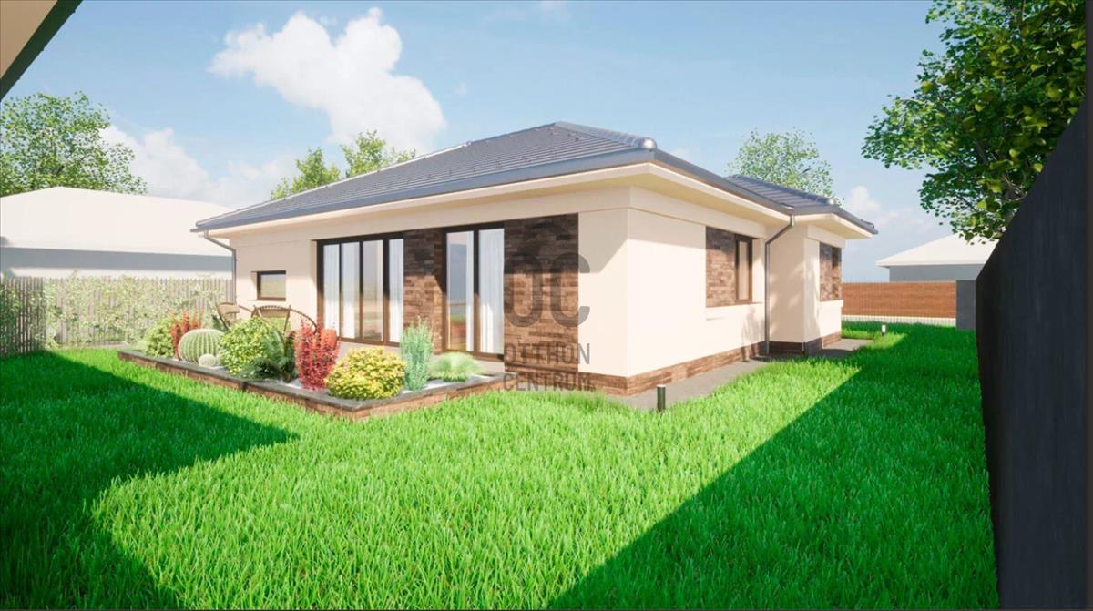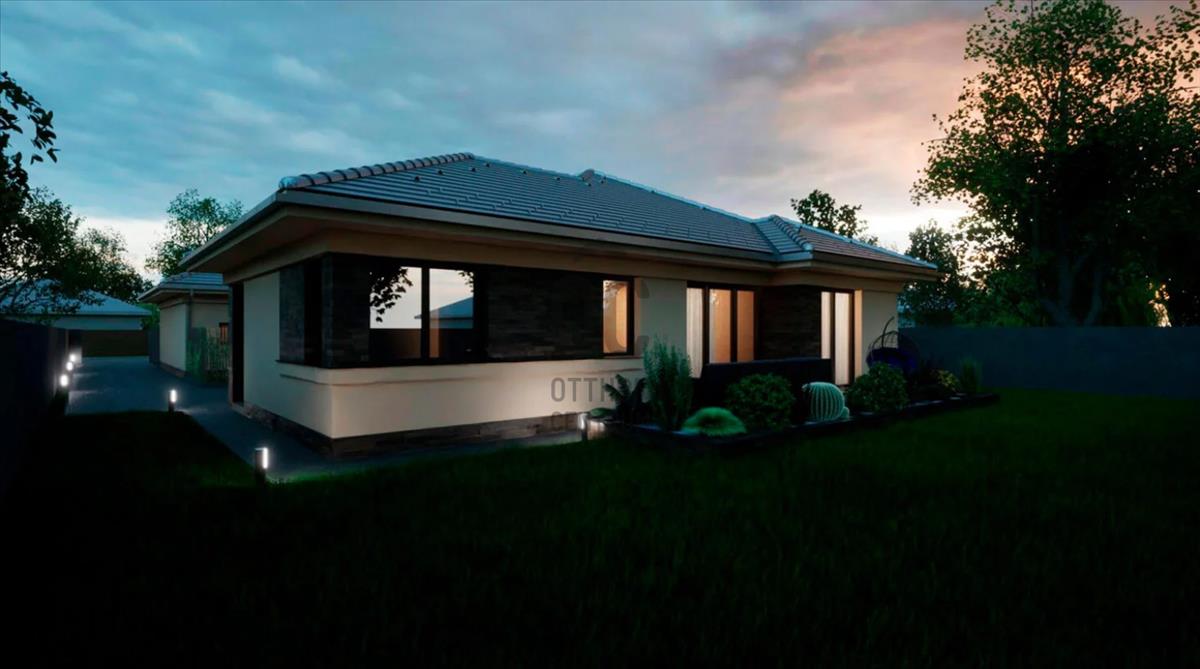 Kelyiségei : konyha - étkező - nappali, 3 szoba, fürdő, háztartási helyiség, garázs, terasz, wc
