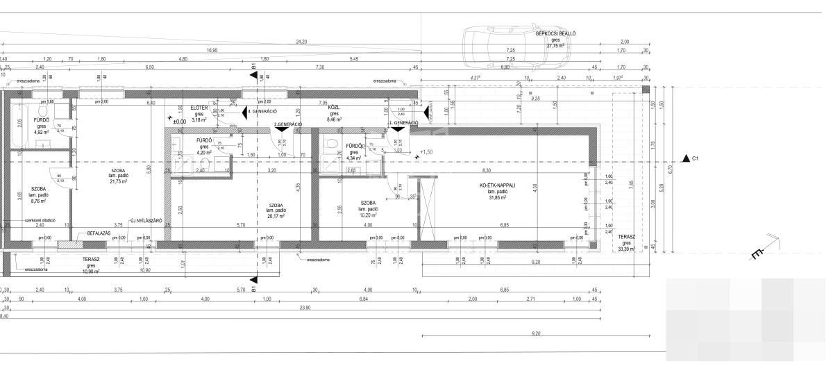 - nappali + étkező+ konyha 31, 85 nm,