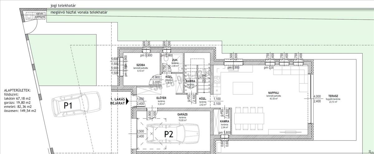 A ház saját 20 m2 méretű garázzsal rendelkezik, belső kapcsolattal.