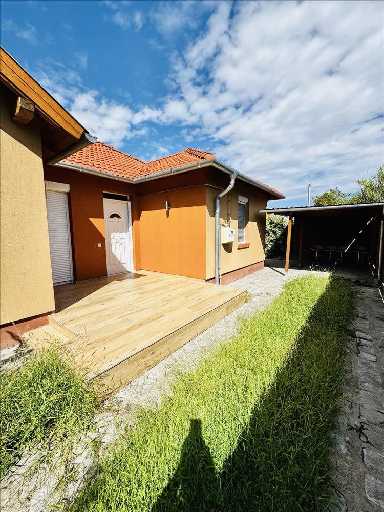Elrendezését tekintve kiváló: előszoba, am-konyhás jó méretű nappali, kádas fürdőszoba WC-vel, két hálószoba, plusz a nappaliból/konyhából kilépve 16 nm-es terasz. a padlástér is pakolható. a kertben 1 autó számára térkövezett, fedett kocsibeálló, akár több autó számára parkolási lehetőség (a kertben + a ház előtt). a kertben kerti csap és zárható tároló. Nappaliból a kertre nyíló kilátás. Fúrt kút. Automata kapu.