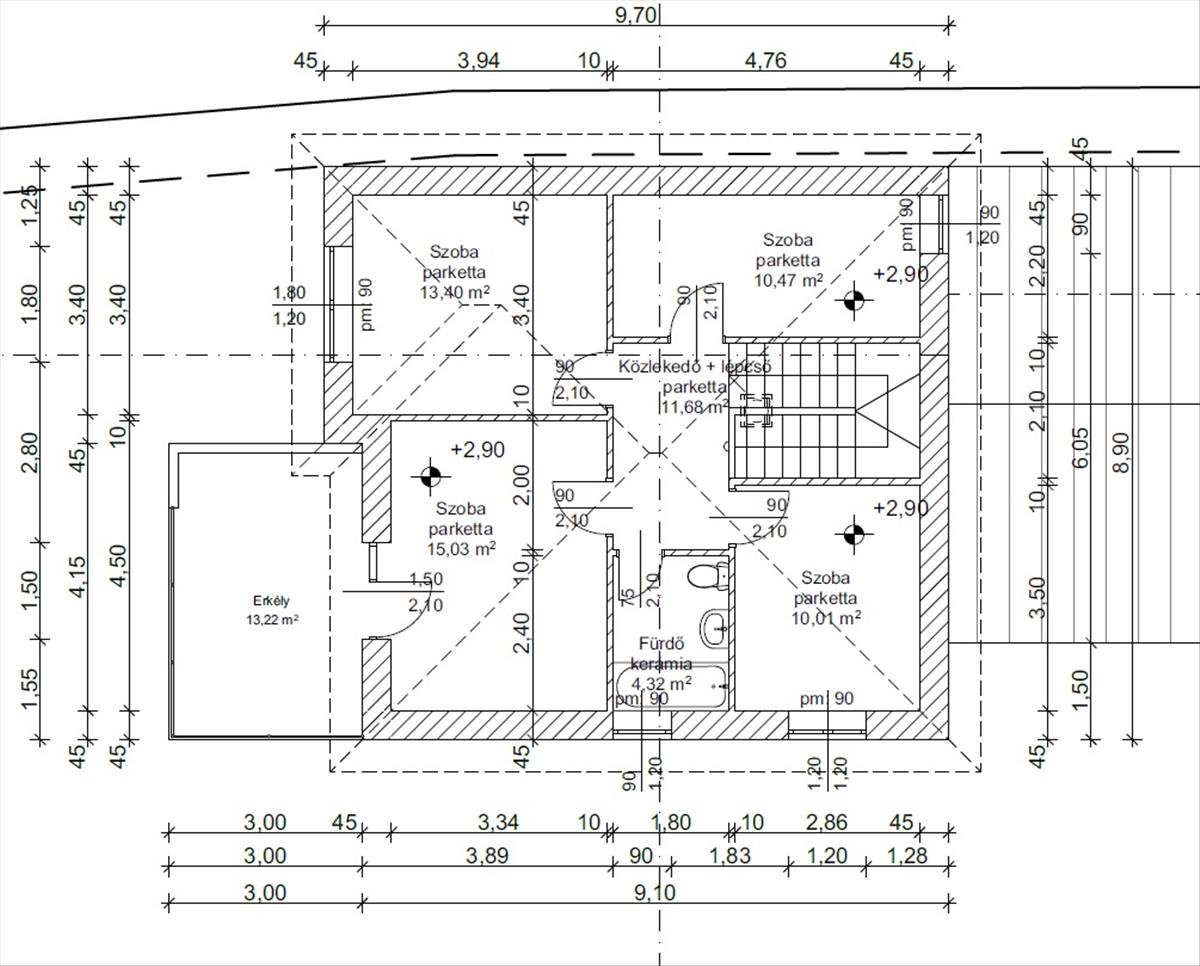 Teraszok: alsó szinten fedett terasz 16, 80m2, emeleti terasz 13, 22m2