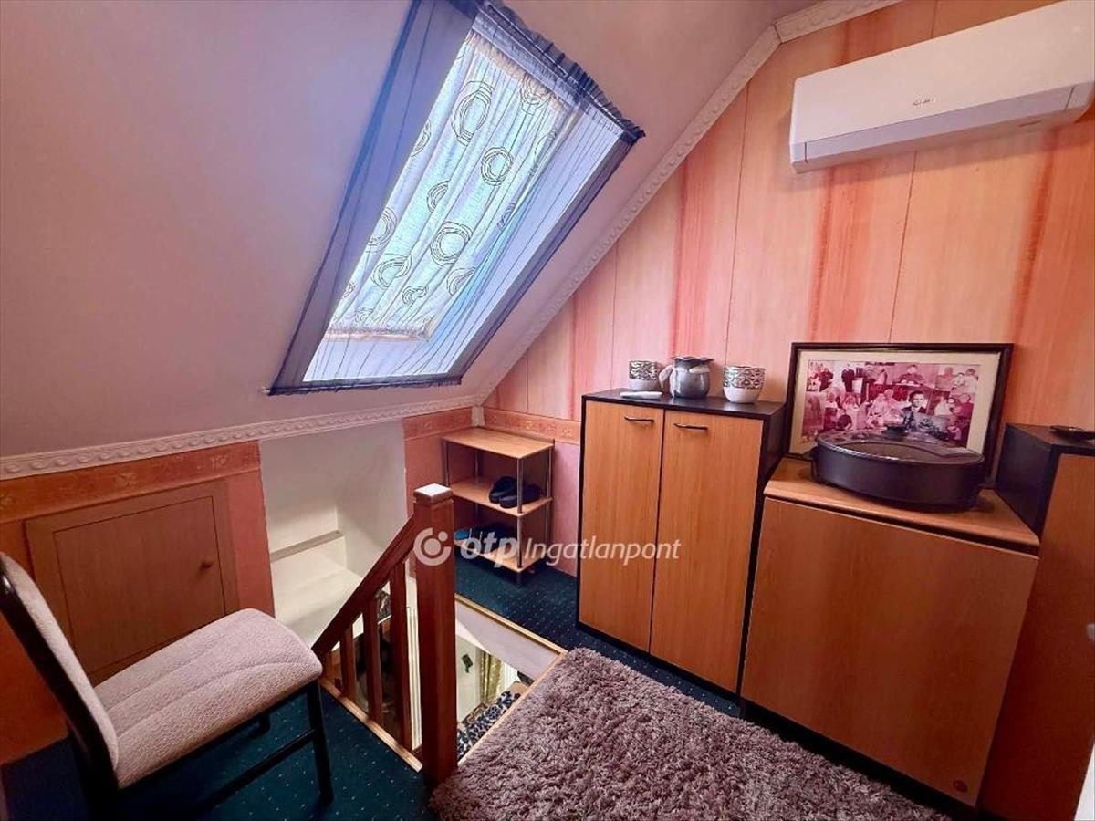 Az alsó szinten egy tágas, egyszobás lakrész kapott helyet, amely esztétikai felújítást és a nyílászárók cseréjét igényli, ugyanakkor az elektromos hálózat már rézkábelezéssel készült. a felső lakrész külön bejárattal rendelkezik, jó állapotú, beépített bútorokkal felszerelt, a tetőtér pedig beépítésre került, ahol további egy szoba található. a felső szinten a nyílászárókat már korszerű műanyagra cserélték, az ingatlan klimatizált, gépészeti és elektromos szempontból is rendezett állapotban van.