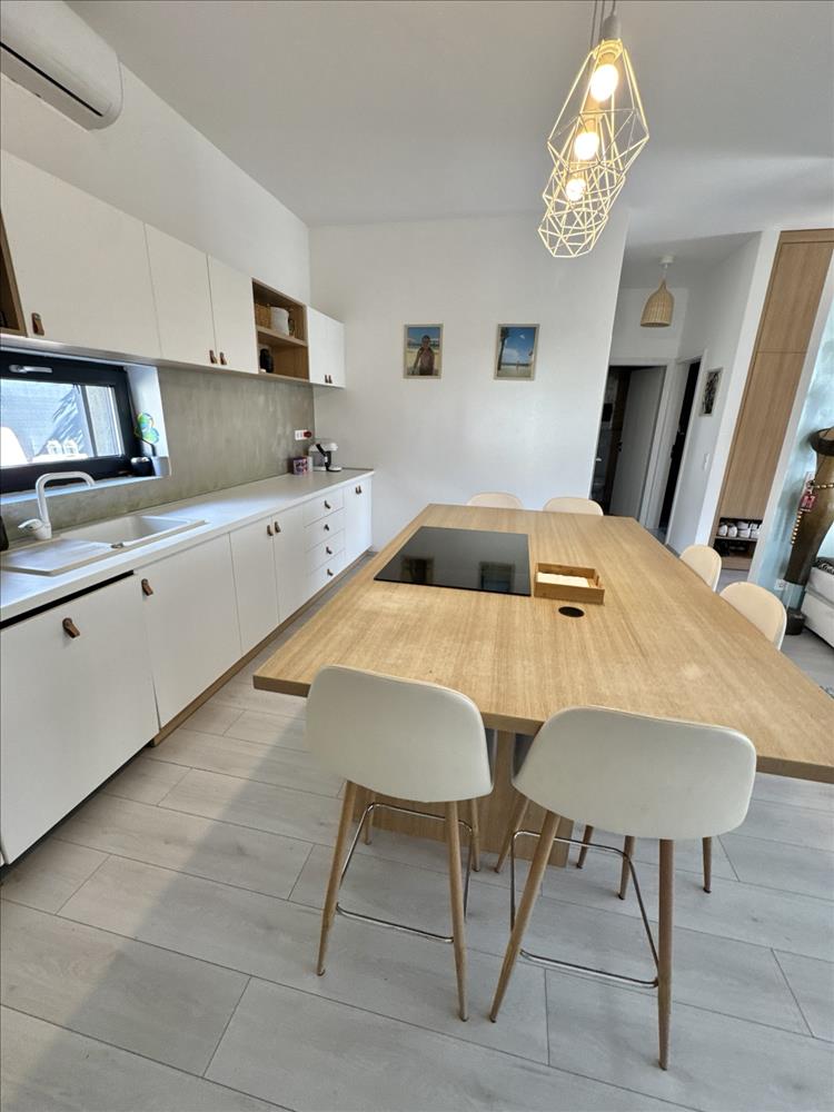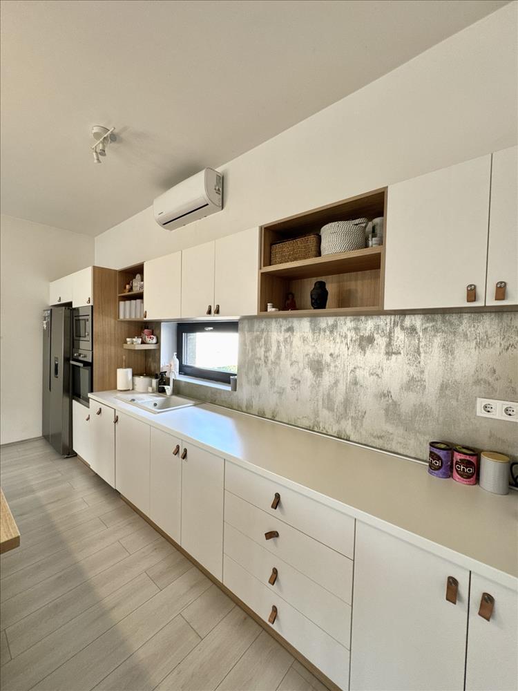 A belső tér elegáns és letisztult – egyedi tervezésű bútorok, csendesített fiókok és ajtók, minőségi burkolatok és energiatakarékos beépített gépek biztosítják, hogy ez az otthon nemcsak szép, hanem kifejezetten praktikus és gazdaságos is legyen.