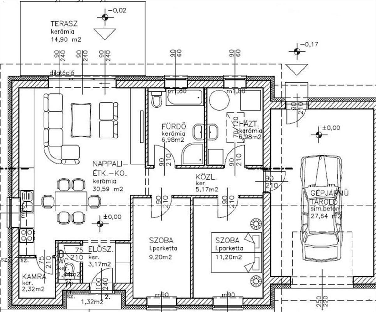 egy fürdőszobát WC-vel, egy külön WC-t, háztartási helyiséget, fűtött garázst és egy teraszt foglal magába.
