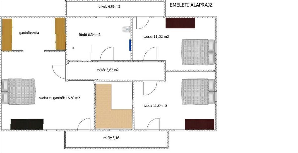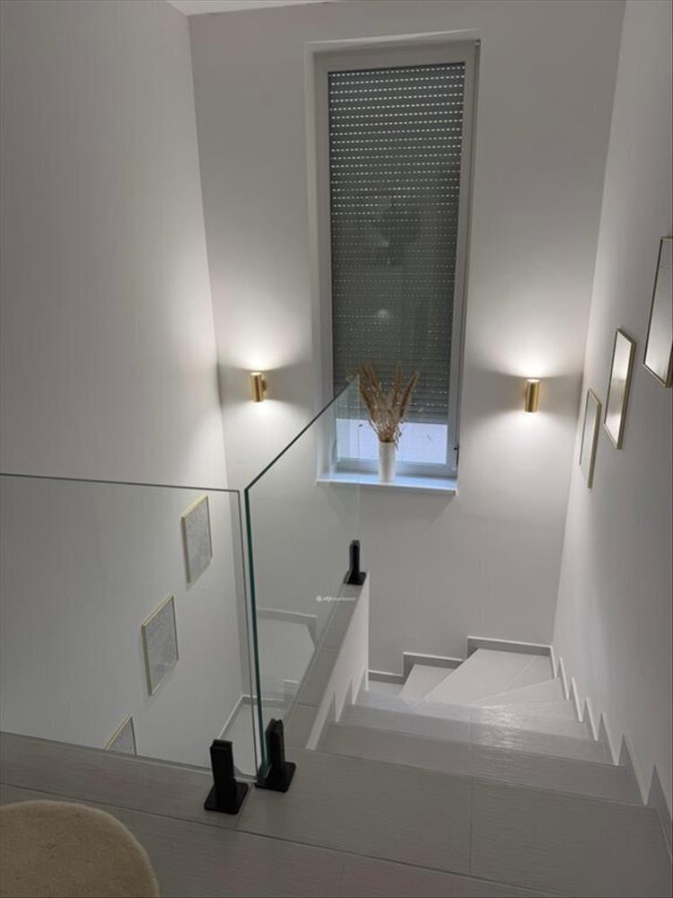 Ezen a szinten még egy exclusive kádas, duplamosdós fürdőszoba áll a rendelkezésünkre geberites WC-vel. a nappaliból pedig kiléphetünk a hátsó kertbe, gyönyörű napozó terasszal, parkosított, fákkal szegélyezett, füves kertre. Az ebédlő térből nyílik a felső szintre felfutó hófehér lépcsősor, mely impozáns üvegkorláttal szegélyezett, világos, fényes. Felérve az emeletre egy közlekedő térbe érkezünk, ahonnal három hálószoba, egy gardrób szoba és egy fürdőszoba nyílik. Minden szoba ablakos és teraszos, ami a kitűnő elcsúsztatott tervezés eredménye. a gardrób és a szobák is Ikea bútorokkal harmonizálnak.