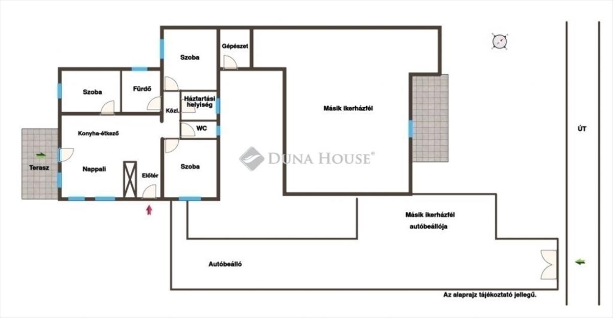 Az ingatlan elrendezése rendkívül praktikus: amerikai konyhás nappali, három hálószoba, előtér, fürdőszoba, külön wc és háztartási helyiség alkotják a belső tereket. a gépészeti helyiség a másik ikerházfélhez kapcsolódik. a házhoz egy körülbelül 18 m²-es nyitott terasz is tartozik, illetve egy saját autóbeálló.