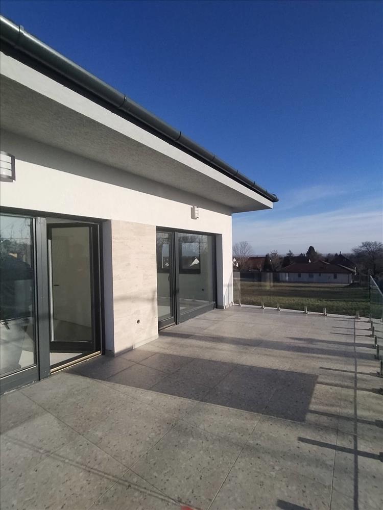 épített, kétlakásos, dupla garázsos kétszintes ikerház, több terasszal, saját kertrésszel,